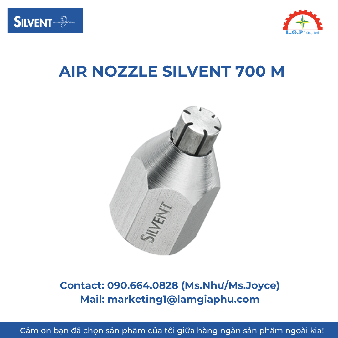 SILVENT 700 M: được làm hoàn toàn bằng thép không gỉ với các khe khí động học để cho phép sử dụng tối ưu khí nén trong khi vẫn giữ mức tiếng ồn ở mức tối thiểu. Thiết kế lục giác phù hợp với cờ lê 14 mm (0,55″). Có kích thước nhỏ hơn các vòi phun khác trong dòng 700 của SILVENT và do đó là lựa chọn phù hợp trong các ứng dụng mà khoảng hở là vấn đề.