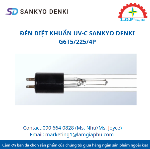 Sankyo Denki G6T5/225/4P đèn UV-C công suất cao của Sankyo Denki, phát ra tia cực tím bước sóng 253,7 nm, khả năng tiêu diệt vi khuẩn, virus các vi sinh vật gây hại hiệu quả. Đèn được thiết kế cho các hệ thống khử trùng chuyên dụng với công suất khoảng 5.9 W, chiều dài 225 mm, đường kính 15.5 mm, chân 4 pin, công suất tia UV khoảng 1.6 W tuổi thọ trung bình khoảng 6.000 giờ.
