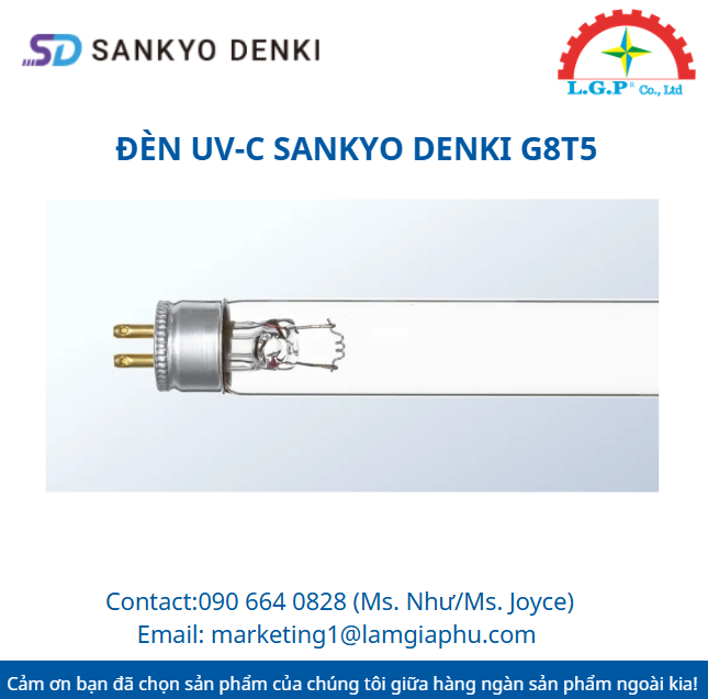 Sankyo Denki G8T5 | Đèn UV-C Sankyo Denki G8T5 là đèn UV-C diệt khuẩn do Sankyo Denki Co., Ltd. sản xuất tại Nhật Bản. Đèn phát ra tia cực tím UV-C với bước sóng 253.7 nm (≈254 nm) – bước sóng có khả năng tiêu diệt vi khuẩn, virus và vi sinh vật rất hiệu quả.