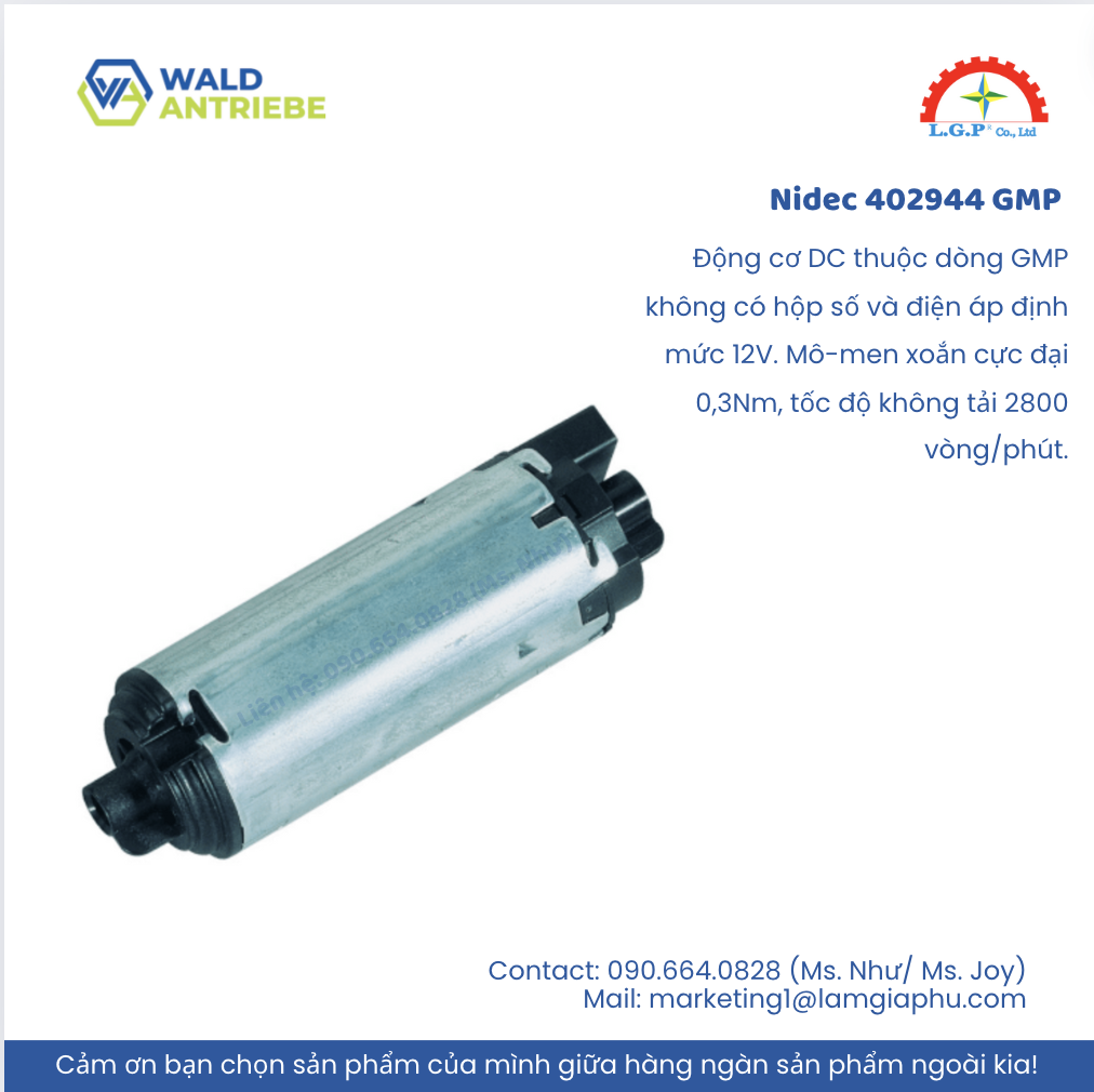 Động cơ truyền động Nidec 402944 GMP thuộc dòng GMP là động cơ truyền động không có hộp số và điện áp định mức 12V. Mô-men xoắn cực đại 0,3Nm, tốc độ không tải 2800 vòng/phút.