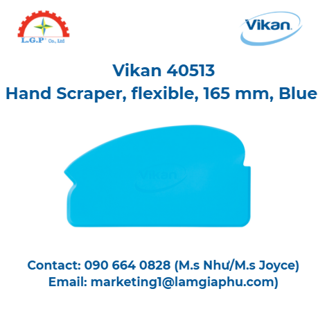 Dụng cụ cạo tay Vikan 40513, dài 165 mm, màu xanh, được thiết kế linh hoạt với cạnh cạo ba mặt, giúp làm sạch hiệu quả bàn làm việc, băng chuyền, cũng như hỗ trợ làm rỗng thùng chứa và xô. Sản phẩm tuân thủ FDA, có thể tái chế thành PP, an toàn và thân thiện với môi trường.