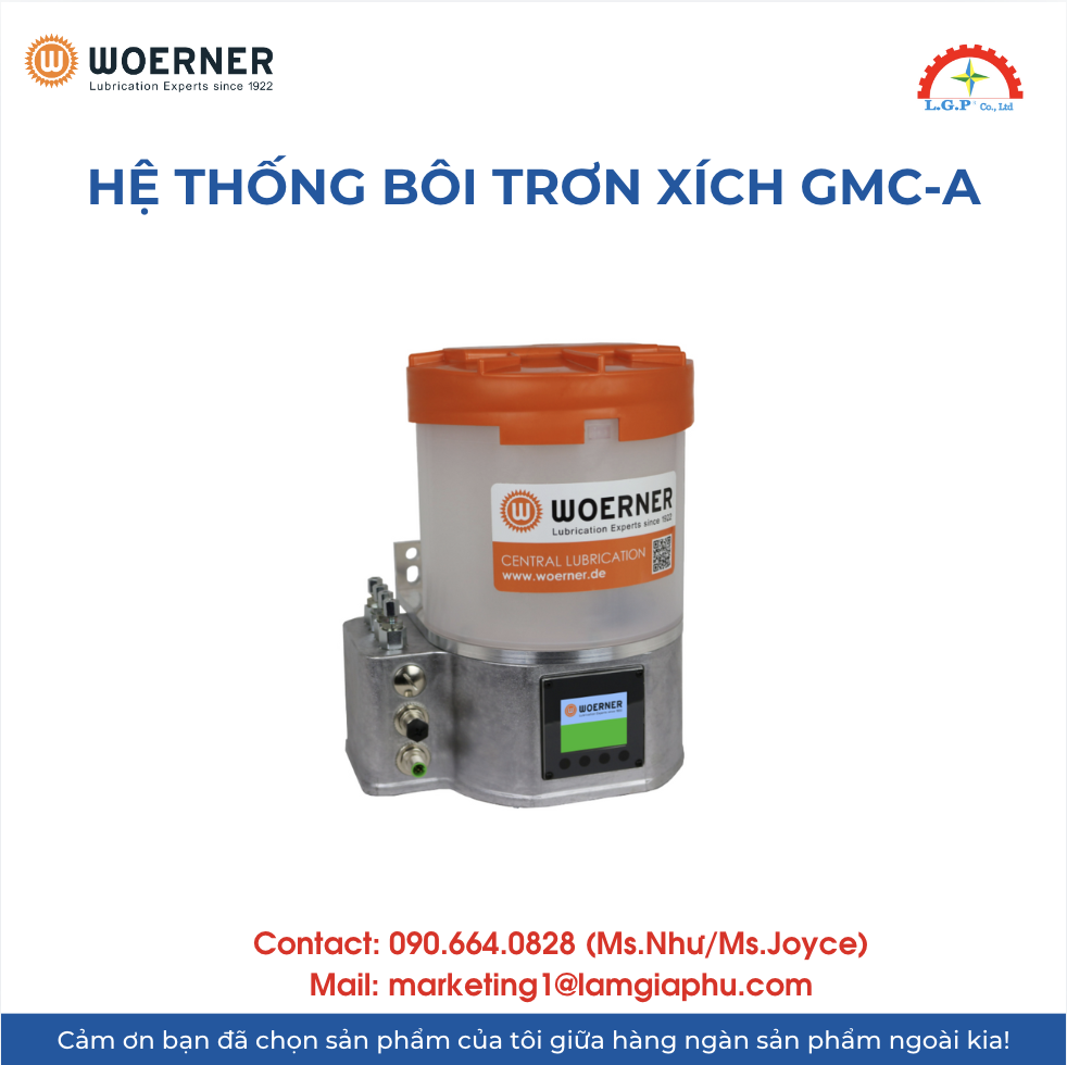 LGP Co., Ltd – Chúng tôi cung cấp Hệ thống bôi trơn xích GMC-A của Woerner , nổi tiếng về chất lượng và hiệu suất vượt trội trên thị trường. Sản phẩm của chúng tôi được khách hàng đánh giá cao về độ tin cậy và chất lượng tiêu chuẩn. Các sản phẩm được kiểm tra cẩn thận, mua từ các nguồn uy tín và có nhu cầu cao. Chúng tôi cung cấp trên toàn quốc với giá cả cạnh tranh. Ngoài ra, chúng tôi còn cung cấp các sản phẩm của các thương hiệu như Silvent, Vikan, Air Torque, Jumo, Yudian,…