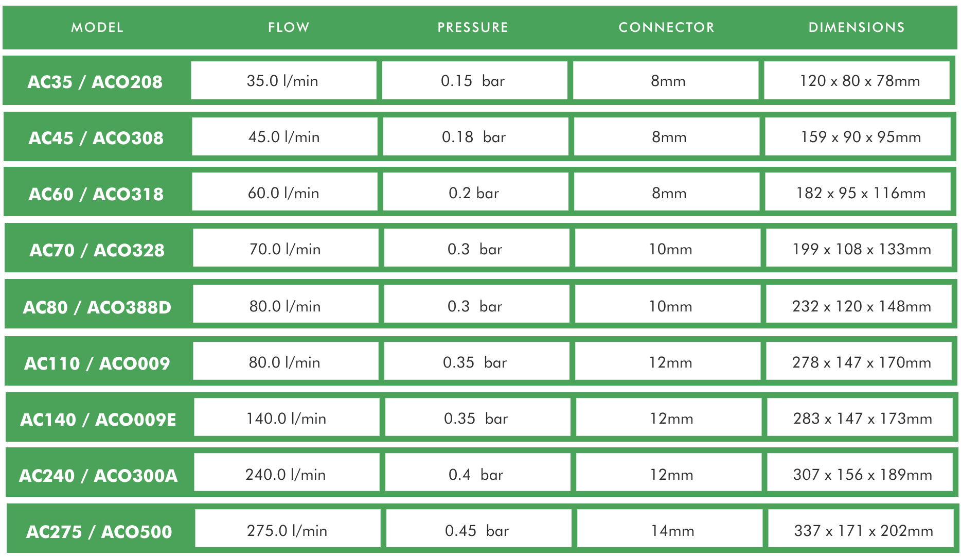 - Bơm piston AC cung cấp lưu lượng cực cao so với kích thước của nó, rất phù hợp cho các ứng dụng chậu đơn trong ngành thủy canh với khả năng cung cấp nhiều chậu cùng một lúc. Được cung cấp với một loạt các ống phân phối, dòng AC nhanh chóng và dễ sử dụng với yêu cầu bảo trì tối thiểu.
